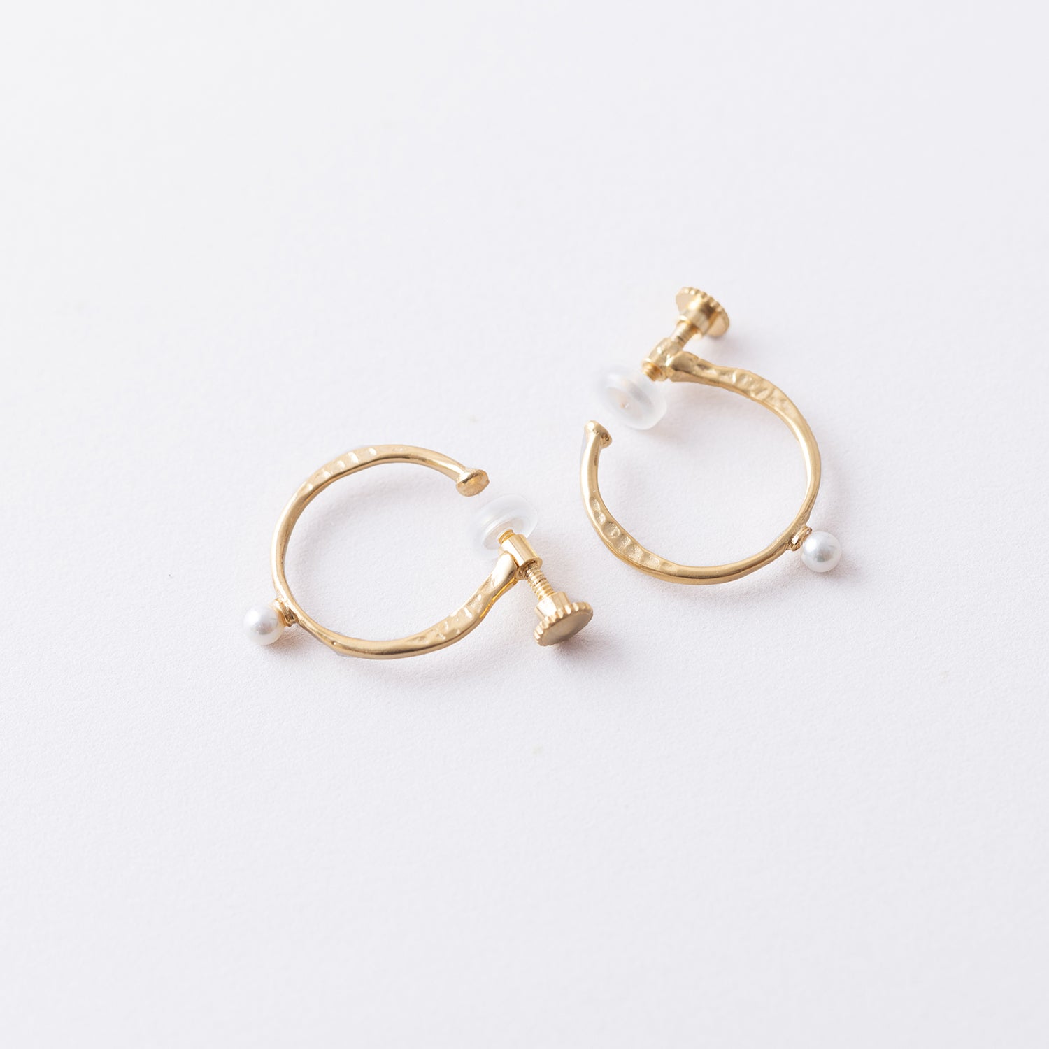 真鍮線に上面・側面から鎚目加工を施し有機的な流線を表現したリングに、貝パールをつけたフープタイプのモダンなイヤリングです。