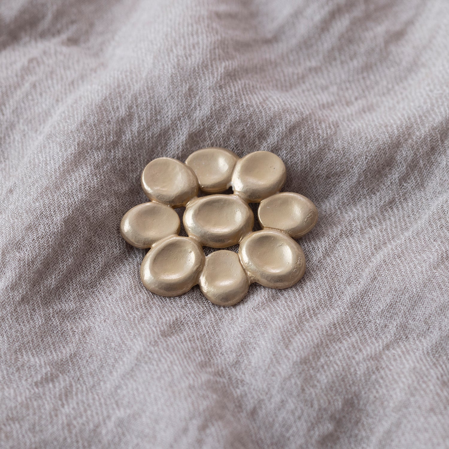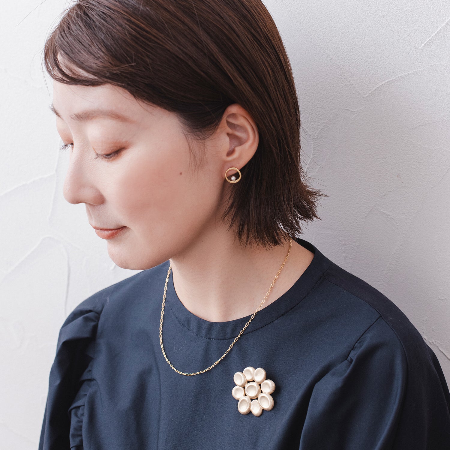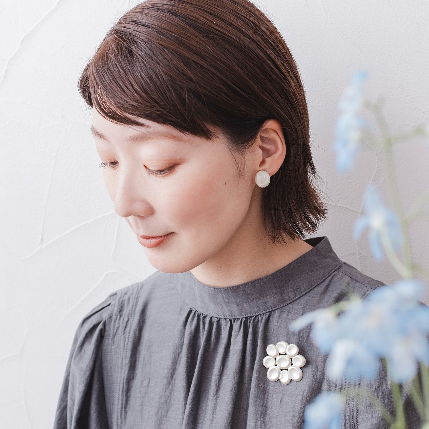オーバルカボションに窪みをつけた表情のあるモチーフを組み合わせてフラワーモチーフに見立てたクラフト感のある華やかなデザインブローチです。