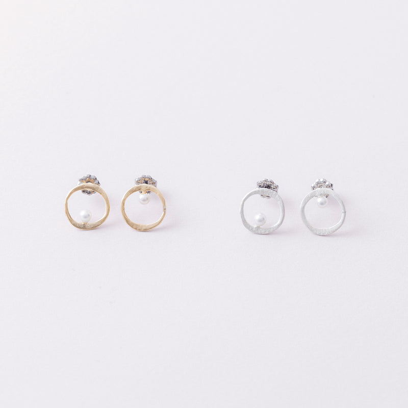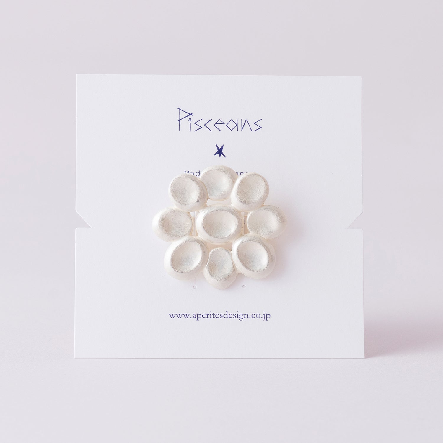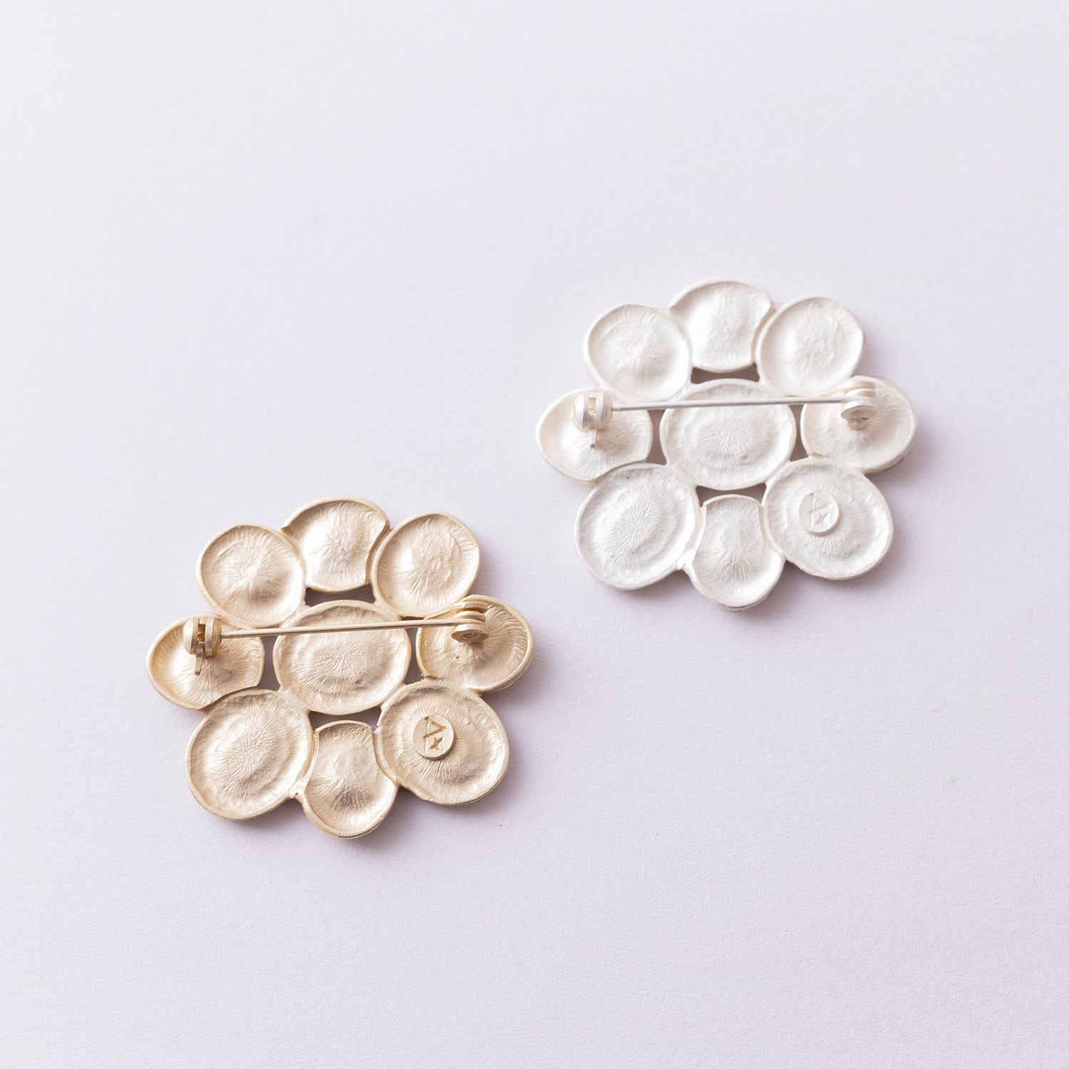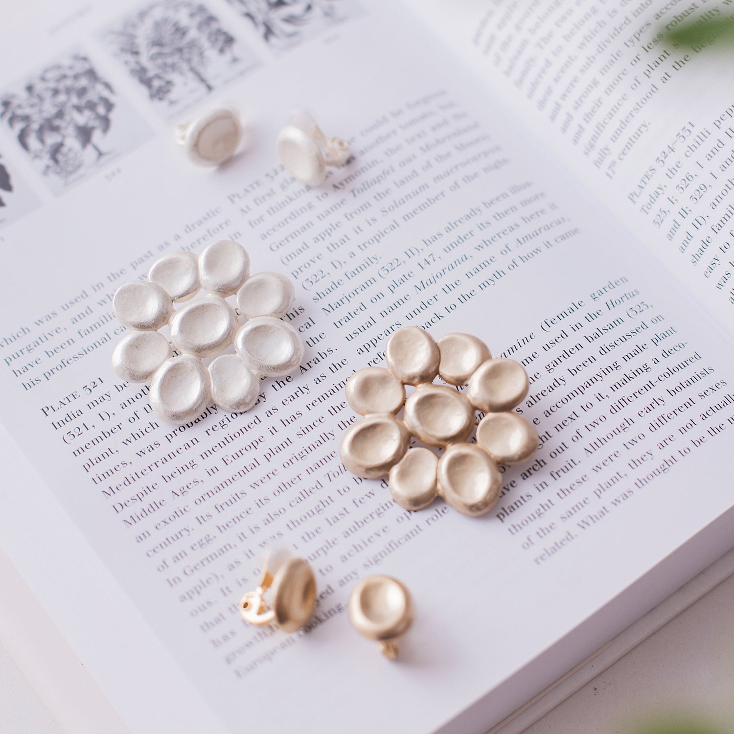 オーバルカボションに窪みをつけた表情のあるモチーフを組み合わせてフラワーモチーフに見立てたクラフト感のある華やかなデザインブローチです。